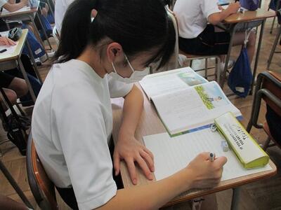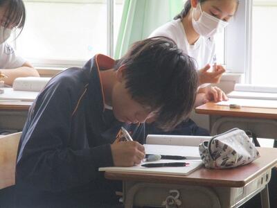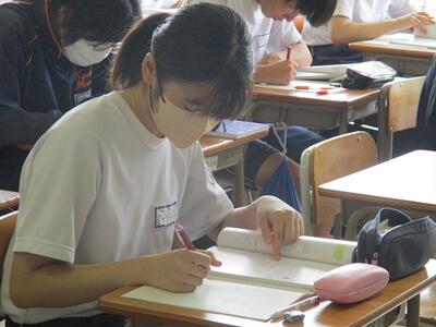 外は台風13号の影響で、風も強く荒れていますが、教室内には落ち着いた爽やかな風が吹いています。南中生は台風なんかに負けません!