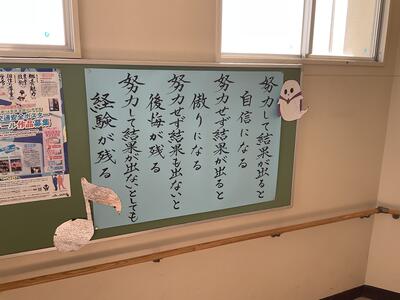 今日は新人戦中心日2日目です。サッカーをはじめ、多くの部が試合に臨んでいます。学校では、自習に真剣に取り組む姿が見られています。階段の掲示物は、本校教員で書の達人が書いたものです。新人戦に臨む生徒へのエールでもあります。頑張れ、南中生!