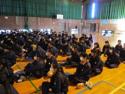 感染症拡大防止の観点から2年生は体育館、1,3年生はリモートで行いました。