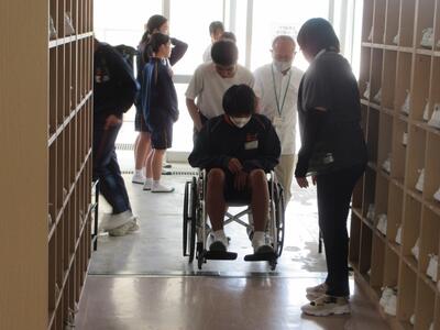 本日2年生は、福祉体験の点字・アイマスクに続き、車いすで生活している人をお招きし、普段の生活の様子や車いすでの苦労話など実際に話を聞き、障がいの理解を深めました。さらに実際に車いすに乗り、怖さ・不便さを体験することで、優しい介助の仕方を考える機会となりました。