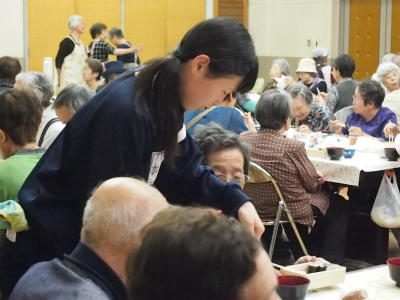 大枝公民館で、敬老食事会がありました。本校からもボランティアとして生徒が参加しました。今回は部活動の練習試合と重なったため、参加できた生徒が3名でした。仕事が多くて大変でしたが、さすがは3年生。手際よく、笑顔でお年寄りと接していました。