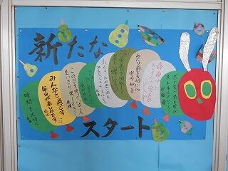 2週間の分散登校を経て、全員での学校再開の日を迎えました。全教職員で作成した掲示物で生徒を迎えました。