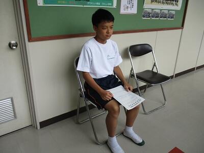 今、1年生が行っています。好きな教科や部活動、将来の夢等について校長先生から質問されます。