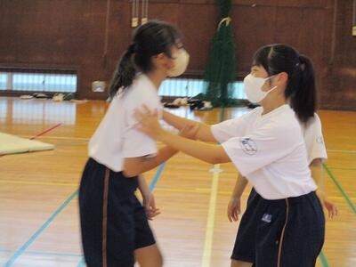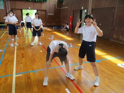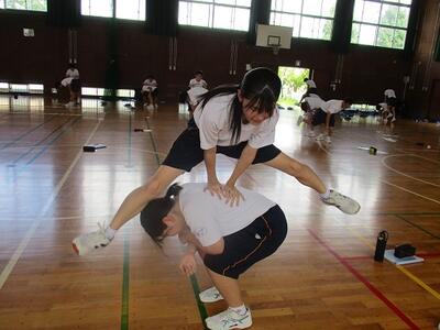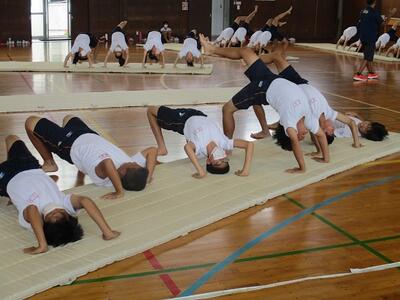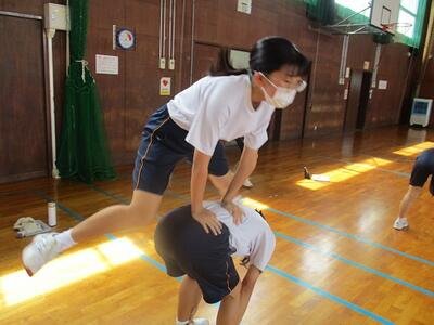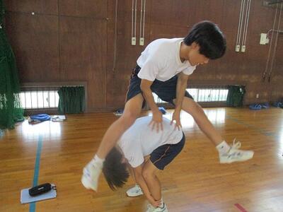 体育の授業では、生徒達が自分で考えて技を工夫したり、難しい技にもチャレンジしていました。