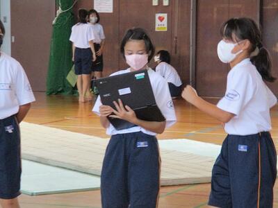 体育の授業では、マット運動や平均台での演技をお互いに撮影して、技術の向上に活用しています。
