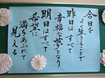 今日は新人戦中心日2日目です。サッカーをはじめ、多くの部が試合に臨んでいます。学校では、自習に真剣に取り組む姿が見られています。階段の掲示物は、本校教員で書の達人が書いたものです。新人戦に臨む生徒へのエールでもあります。頑張れ、南中生!
