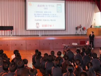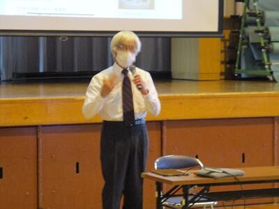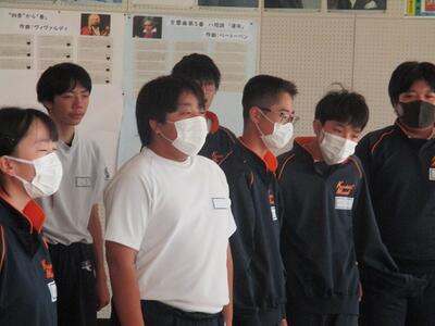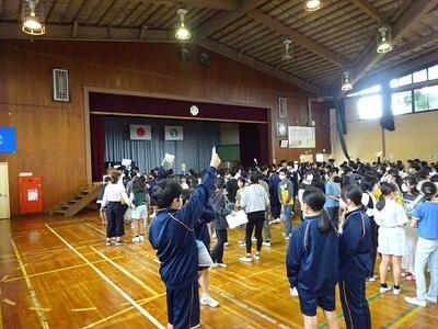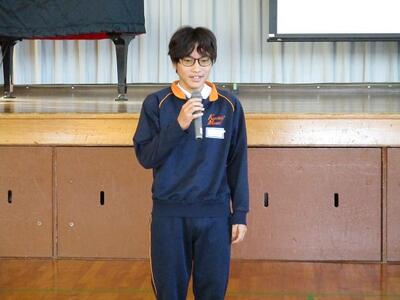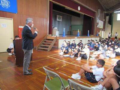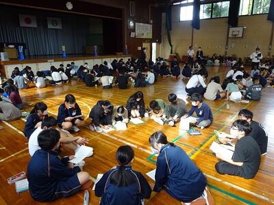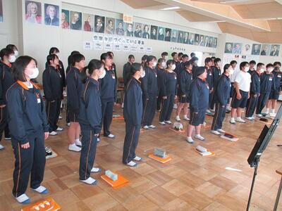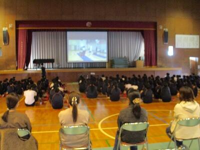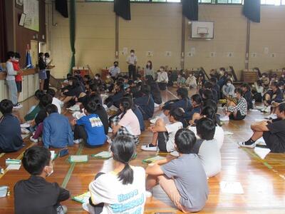 感染症拡大防止の観点から2年生は体育館、1,3年生はリモートで行いました。