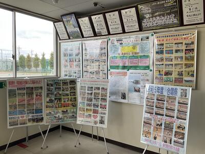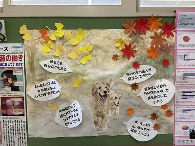 今日は11月の保健室の掲示と職員玄関のパネルを紹介します。11月の生活目標は「机の中、ロッカーの整理整頓をしよう。外に出て積極的に体を動かそう。」です。可愛い2匹の犬が秋空の下、楽しそうに遊ぶ姿を養護の先生が描いたものです。また、職員玄関のパネルは、南中の生徒の活躍を教頭先生がまとめたものです。南中に来校される方々を出迎えるに相応しい素敵なパネルです。来校の際には是非ご覧ください。