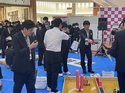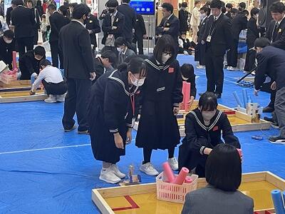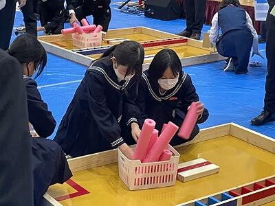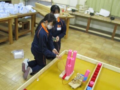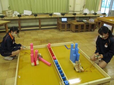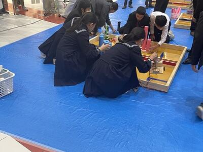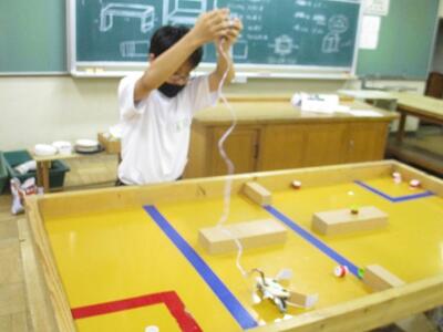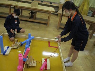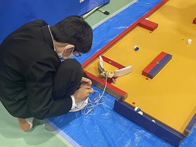 試合に向け、生徒達は実際に使われる物と同じ競技台を使って、実践練習及びマシンの調整を行っていました。頑張れ技術部!