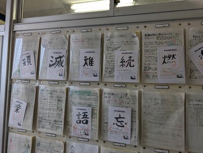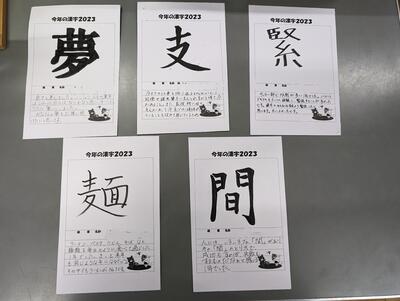 保健室前の掲示が12月になりました。クリスマス、大掃除。2023年が終わろうとしています。2年生では、今年の漢字を書き初めの一環で書いています。先生方にも書いていだいたので一部を紹介します。2学期末で忙しい先生方に教頭先生がクリスマスツリーをプレゼントしてくれました。見ると温かい気持ちになります。