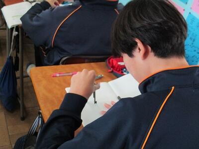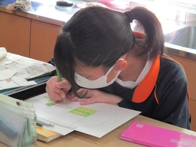 3年生の美術の授業では、ゼンダングル(白い正方形の用紙に黒いペンや鉛筆で点、直線、曲線の組み合わせからなるアート)のパターンを利用して、自分の世界を表現する立方体を制作していました。細かい作業ですが、生徒の集中力には驚かされます。