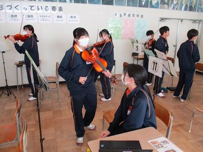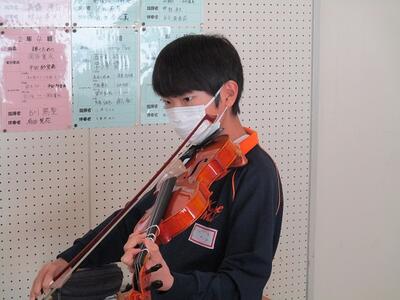 音楽の授業では、バイオリンの実技テストを行っていました。バイオリンの授業も、2学期で終了となります。生徒のバイオリンを弾く素敵な姿が見られなくなるのがとても寂しいです。