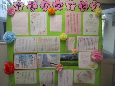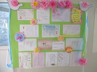 保健室前の廊下の掲示物が3月バージョンに変わりました。