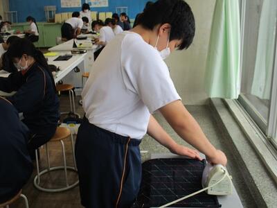 家庭科の授業では、ミシンやアイロンを使って作品を仕上げていました。