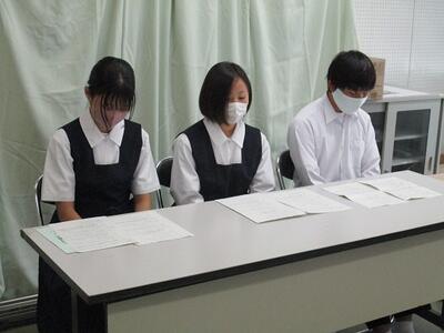 生徒が司会進行を務め、各クラスの代表者による作文発表や修学旅行、進路についての説明がありました。
