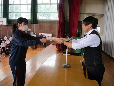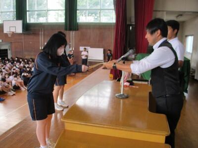 出席確認後、体育館で対面式の表彰集会を行いました。