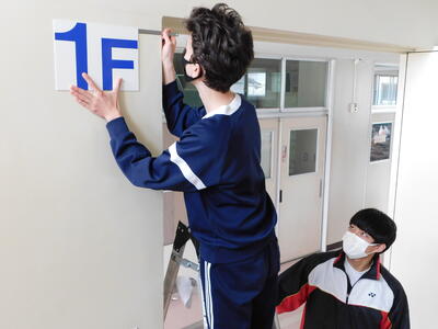 3年生の有志が、自作の「階数表示板」を各階に設置してくれました。カッティングシートから数字を切り抜き、プラ板に貼り付けて作りました。受験勉強もある中、放課後に少しずつ作業をしてくれたものです。素敵な「卒業記念品」になりました。