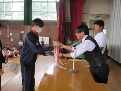 出席確認後、体育館で対面式の表彰集会を行いました。