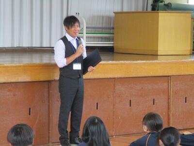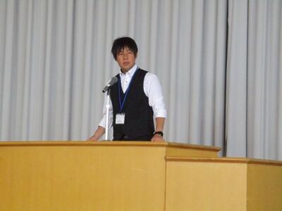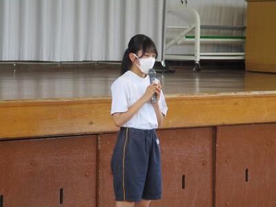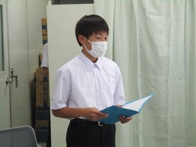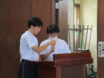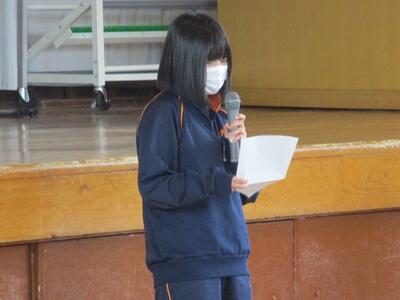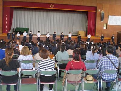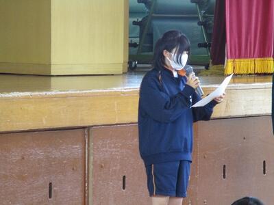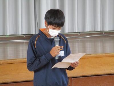 生徒が司会進行を務め、各クラスの代表者による作文発表や修学旅行、進路についての説明がありました。