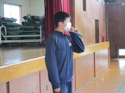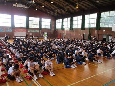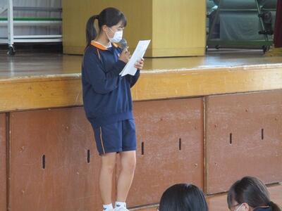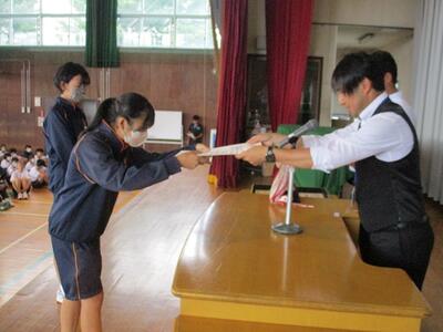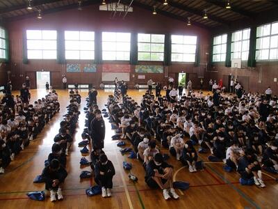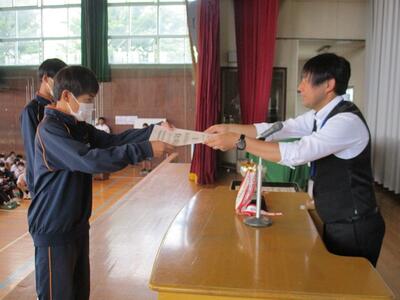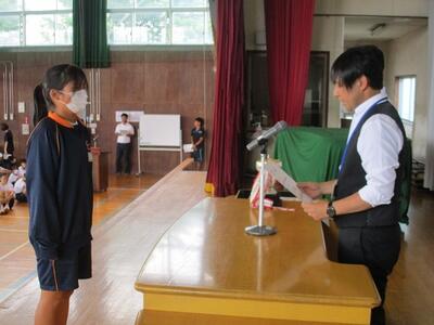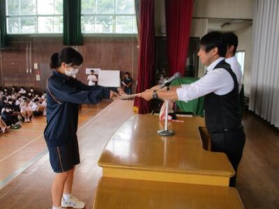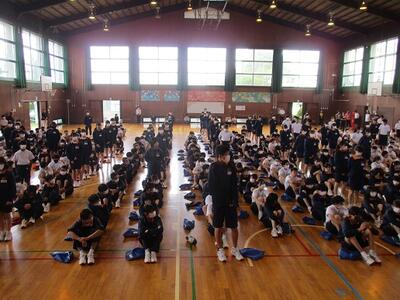 出席確認後、体育館で対面式の表彰集会を行いました。