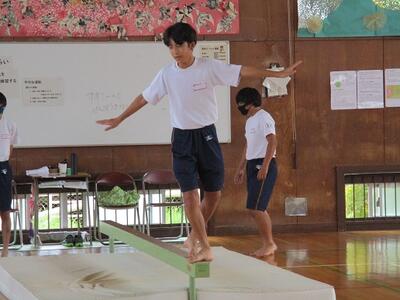 体育の授業では、生徒達が自分で考えて技を工夫したり、難しい技にもチャレンジしていました。