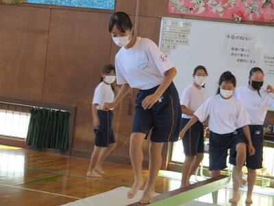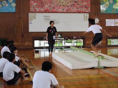体育の授業では、生徒達が自分で考えて技を工夫したり、難しい技にもチャレンジしていました。