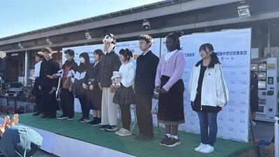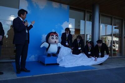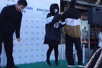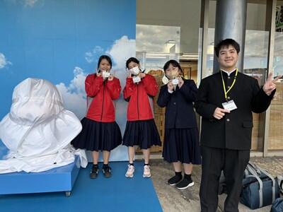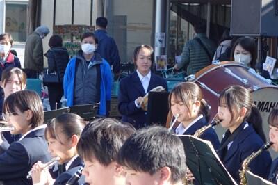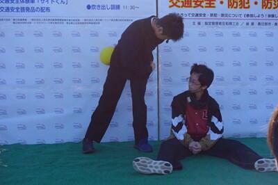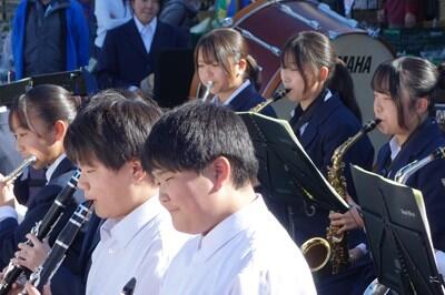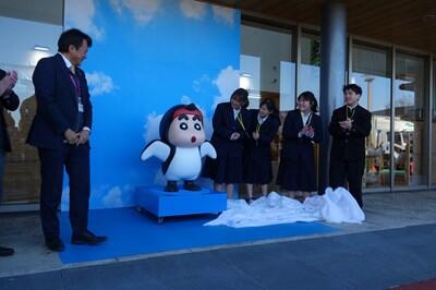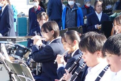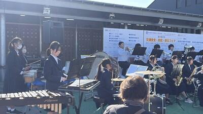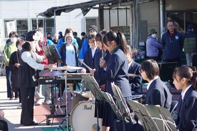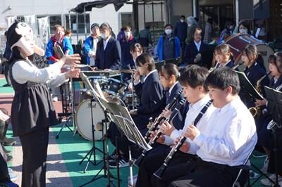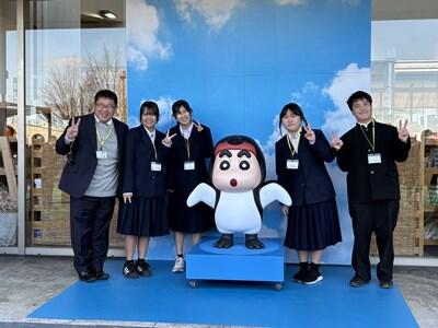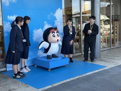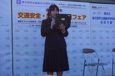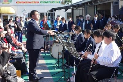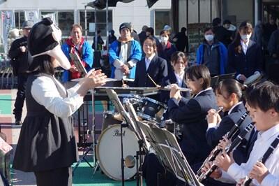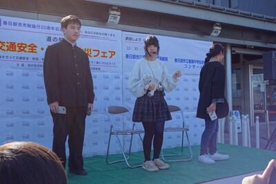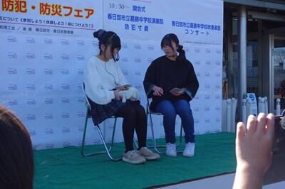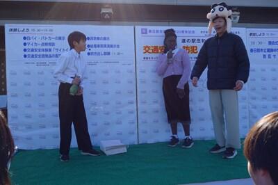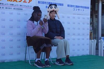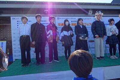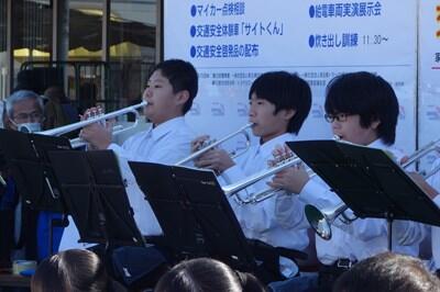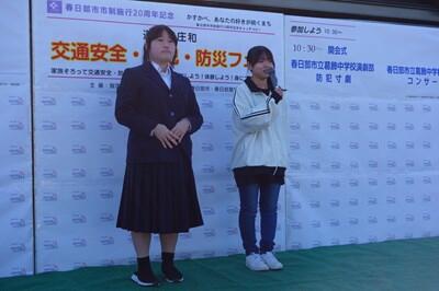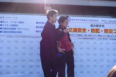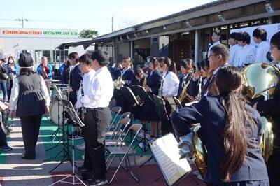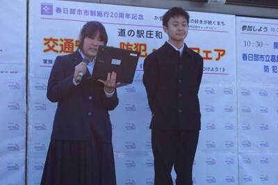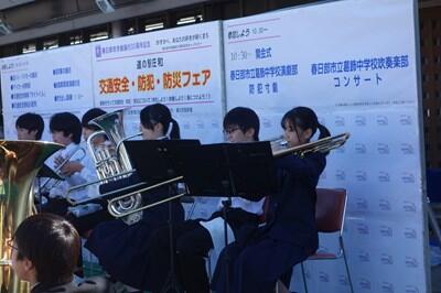 道の駅庄和で開催された「交通安全・防犯・防災フェア」に本校吹奏楽部と演劇部が出演しました。この機会に新しく道の駅庄和にお目見えしたクレヨンしんちゃんのモニュメント「ツバメしんちゃん」のお披露目式には、それぞれの部から代表生徒が参加し、市長さんの掛け声に合わせ布を引くと、かわいい「ツバメしんちゃん」が姿を現しました。その後、吹奏楽部は「オラはにんきもの」ほか4曲を演奏、演劇部は交通安全・防犯・防災をテーマにしたオリジナルの大変優れた寸劇を披露しました。