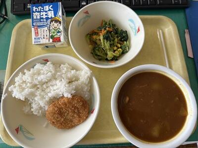 ・若獅子カレーのコロッケのせ(ごはん、カレールウ、ポテトコロッケ)・牛乳・選手も好きなブロッコリーのサラダ