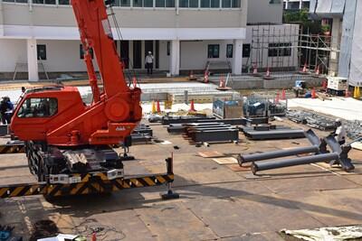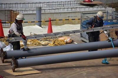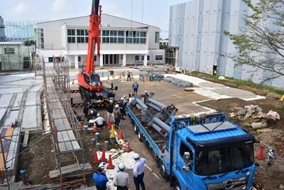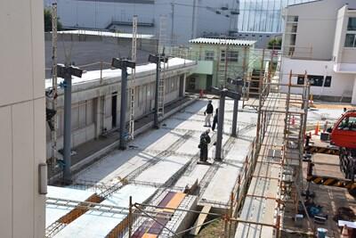 9月第3週がスタートしました!まだまだ暑さは厳しいですが、確実に秋の「気配」は感じられつつあります。3年生は明日、修学旅行に向けて荷物の積み込みがあります。学校では、中庭に大型車輛がやってきて(あの大きいトラックがピロティの横のスペースを潜り抜けた!!)、メディアセンターから体育館に架かる大屋根に使われる、柱と梁が運び込まれ、今日から4日間かけて据え付け工事が行われます。とにかく大きく、いかにも重そうな鉄柱は、一度地面に置かれた後、垂直になった後に作業をするための梯子が素早く取り付けられたあと、2本のベルトがかけられ、きわめてバランスよくクレーンで持ち上げられ、あらかじめ組まれた基礎の鉄筋部分に据え付けられました。本当に大掛かりな工事です。そしてその工程は驚くほどスムーズです。