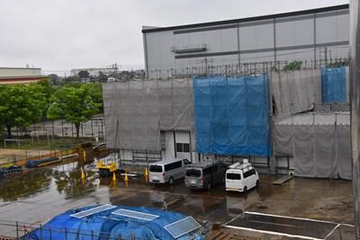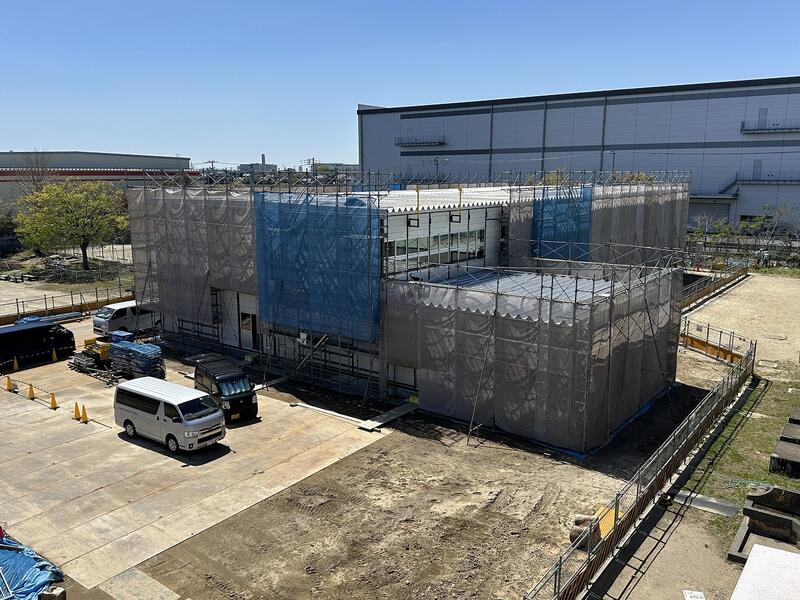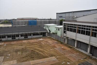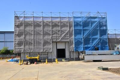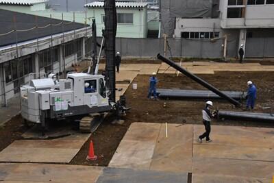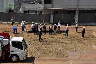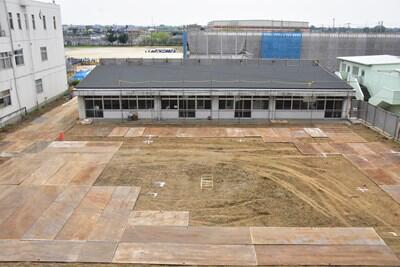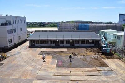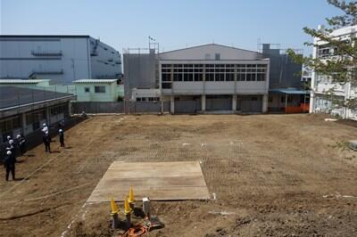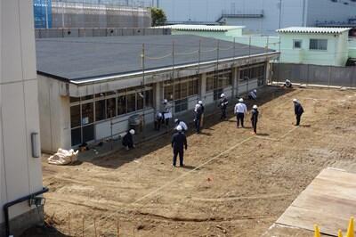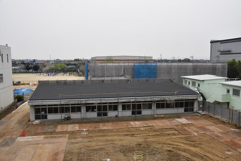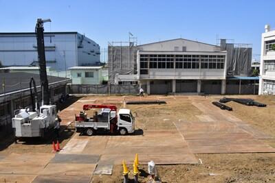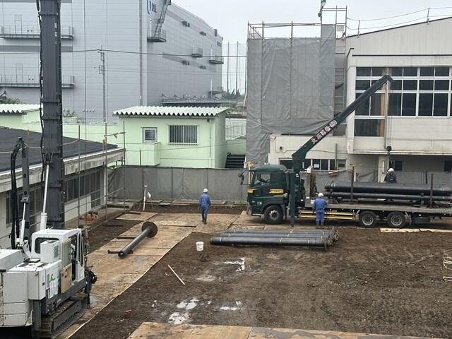 リノベーション工事は着々と進められています。仮設校舎は壁面に断熱材が入れられ、この後は、外壁の仕上げ材が施工されるそうです。中庭は、新しくできるメディアセンターと体育館の入口に架かる大きな屋根を支えるためでしょうか。かなりの長さのある、太い杭がたくさん打ち込まれていました。