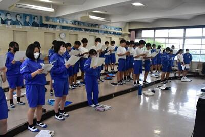 わたしたちの身体はまだ「暑さ」に慣れていません。そうしたこの時期こそ、熱中症への備えが重要です。食事・睡眠時間をしっかり確保し、登校時には十分な量の水分を用意し、こまめな水分補給と活動の中での休息も必要です。少しでも体調がすぐれない時には部活動への参加を控えるなどの対応も大切です。恐ろしい熱中症への備えをご家庭でもよろしくお願いいたします。