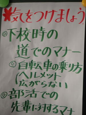 放課後、1年生の自転車通学者を集めて自転車安全集会を開きました。そこでルール・マナーや自転車を駐車する場所、通学路、工事中の迂回路の確認等をしました。最後に自転車に貼る鑑札が渡されました。