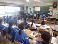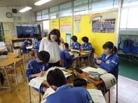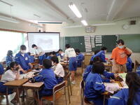 2年生の社会で協調学習(ジグソー法)による授業が行われていました。協調学習とは、「複数の学習者が意見を交換し,協力し合いながら解を導こうとするという学習形態」、要するに「子どもたち同士が教え合い学び合う 」学習のことです。①エキスパート活動(1つの課題について専門的に学習する:今日の場合は「世界の人口」「日本の人口」「日本の人口分布」という課題を班員が1つ担当し、調べ上げる活動)、②ジグソー活動(班員がそれぞれ調べ上げた課題を、ジグソーパズルのようにまとめ上げる活動)、③クロストーク活動(ジグソー活動でまとめた内容で学習課題(日本の人口は、世界と比べてどのような特色があるか?)に迫る活動)という流れで授業を展開しました。生徒は、資料を用いて一生懸命調べたり、調べたものを必死に他の班員に伝えていました。この活動がまさしく対話を通して理解を深めるアクティブラーニング型授業です。