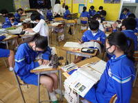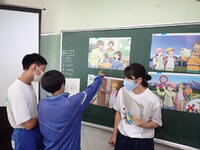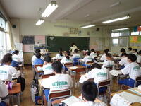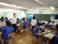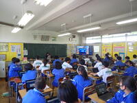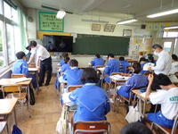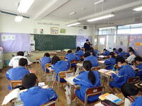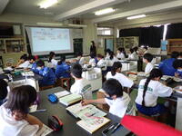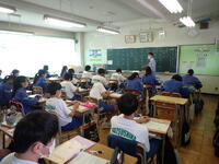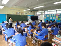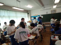 2年生の社会で協調学習(ジグソー法)による授業が行われていました。協調学習とは、「複数の学習者が意見を交換し,協力し合いながら解を導こうとするという学習形態」、要するに「子どもたち同士が教え合い学び合う 」学習のことです。①エキスパート活動(1つの課題について専門的に学習する:今日の場合は「世界の人口」「日本の人口」「日本の人口分布」という課題を班員が1つ担当し、調べ上げる活動)、②ジグソー活動(班員がそれぞれ調べ上げた課題を、ジグソーパズルのようにまとめ上げる活動)、③クロストーク活動(ジグソー活動でまとめた内容で学習課題(日本の人口は、世界と比べてどのような特色があるか?)に迫る活動)という流れで授業を展開しました。生徒は、資料を用いて一生懸命調べたり、調べたものを必死に他の班員に伝えていました。この活動がまさしく対話を通して理解を深めるアクティブラーニング型授業です。
