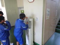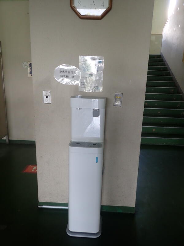 「春日部市役所プラスチック・スマート宣言」に基づき、ウォーターサーバー(常温)を1年間無償貸与という取組を活用し、本校に2台設置されました。1台はB棟昇降口(1,2年生用)、1台はA棟昇降口(3年生用)です。常温とは言え、高い浄水能力で「いつもおいしい水が飲み放題」という環境が整いました。連休が明けたらすぐに使用できます。ただ注意事項が1点。これは直接口を近づけ飲むものではなく、ボトル・水筒・カップに注ぐようになっています。優れた点は、同時に2つ注ぐことができます。左側は上部にあるダイヤルをひねれば給水します。右側はボトル等を奥に押し込むだけで給水します。賢い使い方としては、家庭で水筒内にたくさんの氷を入れて学校で給水すればいつでも冷たい水を飲むことができます。是非活用してください。