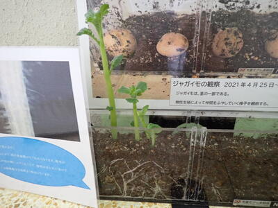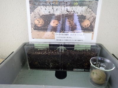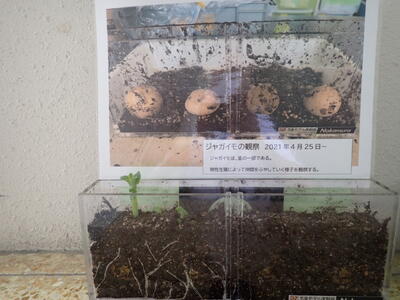 植物も生き物だということがよくわかります。「根毛」もはっきりとわかりました。ジャガイモから芽が出始めました。