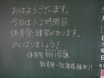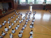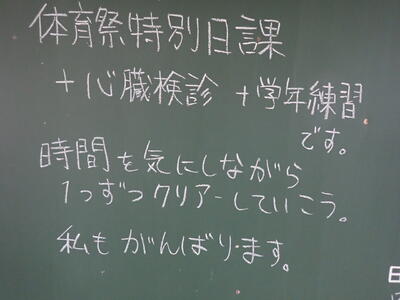 今日は、各学年の体育祭練習が予定されていましたが、天候不良のため1,3学年は体育館で行いました。限られた練習しかできなくて残念でしたが、生徒はよく取り組んでいました。