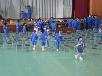 クラス発表後入学式の準備です。卒業式と同様、新3年生が体育館内、新2年生は校舎内と外回りの整備です。