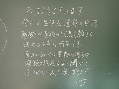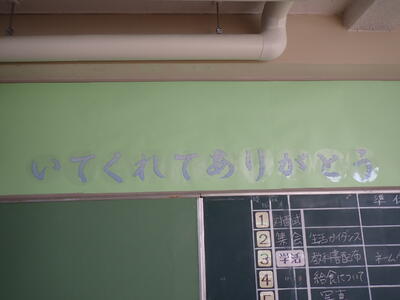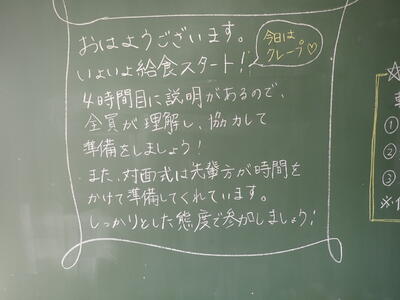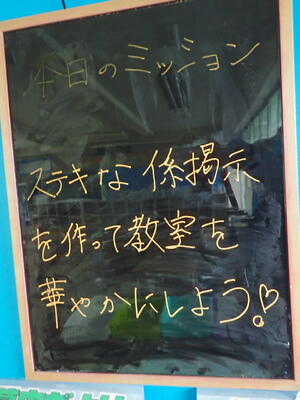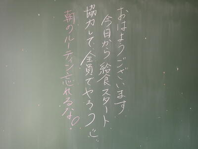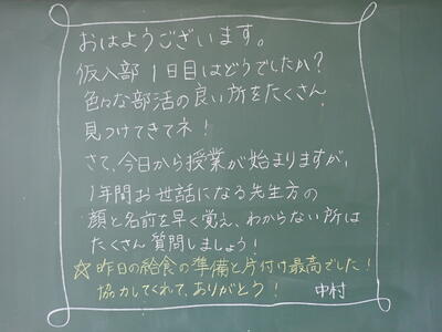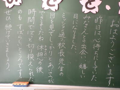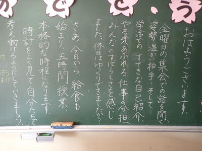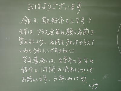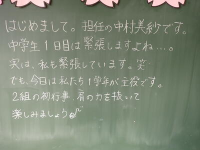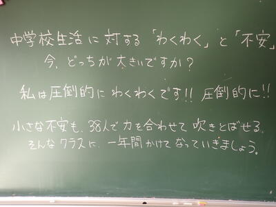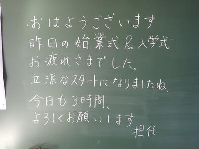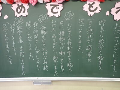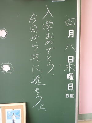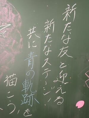 午後は入学式です。黒板にはどのクラスも担任からのメッセージが書かれていました。