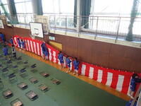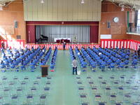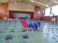 クラス発表後入学式の準備です。卒業式と同様、新3年生が体育館内、新2年生は校舎内と外回りの整備です。