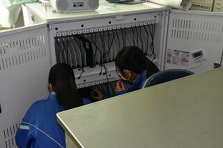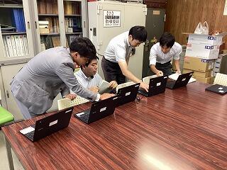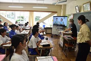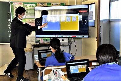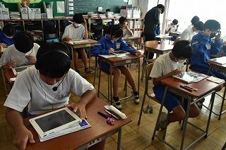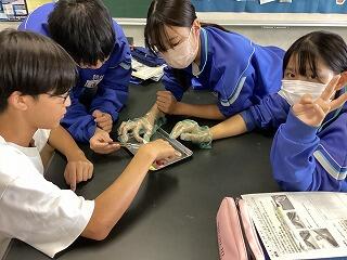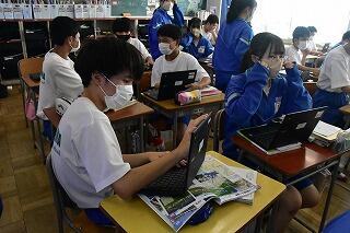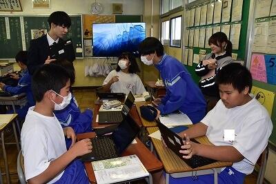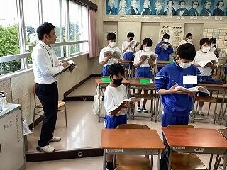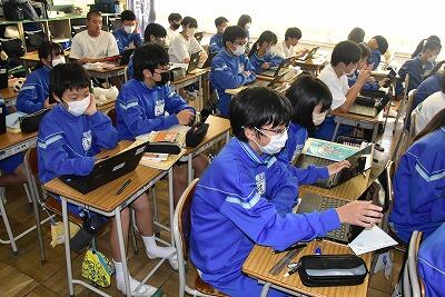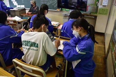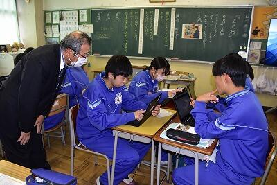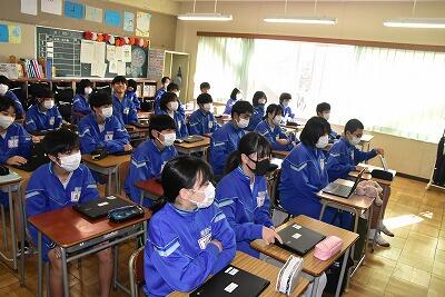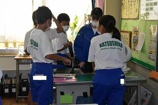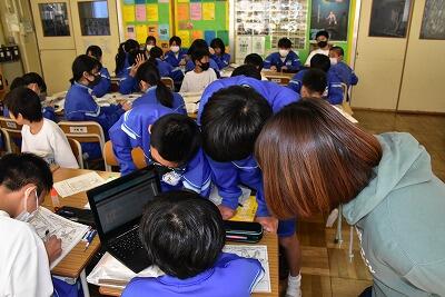 今日は指導者の先生にお越しいただき、道徳の授業研究会が行われました。授業の中でグループごとに春日部市、庄和地区について知っていることやその魅力について、学習用タブレットやインターネットを駆使しながら意見を交わしていました。