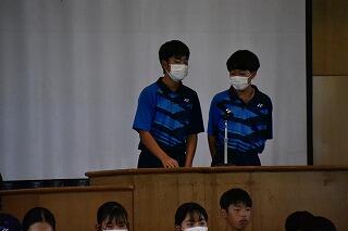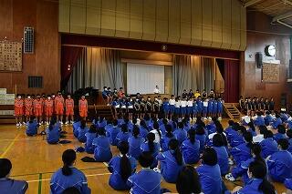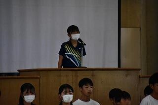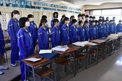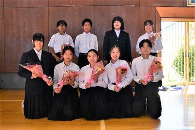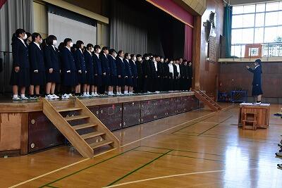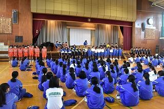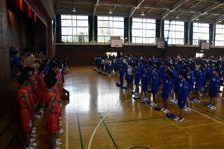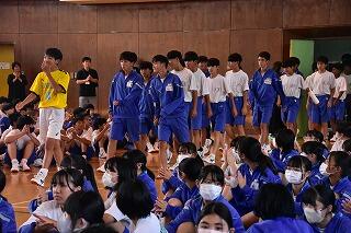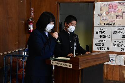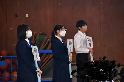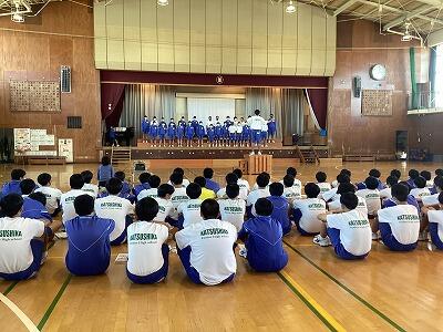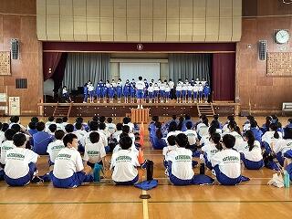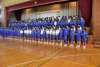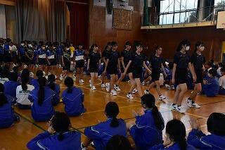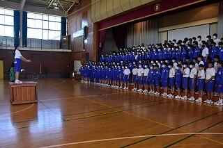 新人戦の県大会に出場することになった生徒のみなさんを全校生徒で応援する壮行会が行われました。各部の代表の言葉や、校長先生のお話、生徒会役員の音頭で、全校生徒と先生方で送った「エール」、体育館いっぱいに響いた校歌。生徒会役員のみなさんが中心に企画した壮行会は、大変心温まる素晴らしい会となりました。