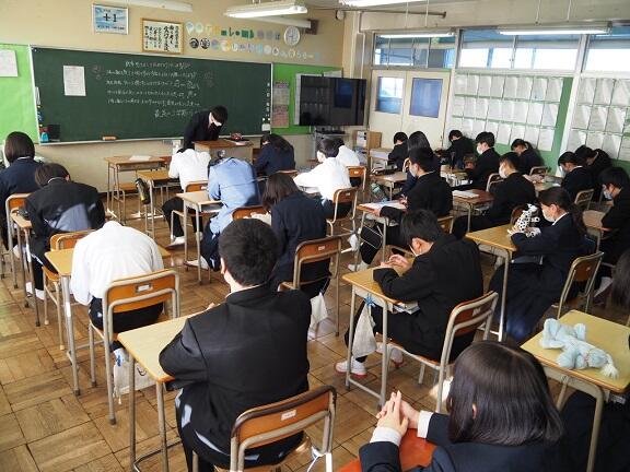 入試直前、本番さながらのテストで、教室には高い緊張感が漂います。日程も教科の順番も県公立高校の入試さながらです。
