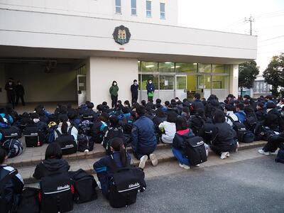 北風が強く、寒い朝ですが、葛中生は元気に登校してきます。生徒会のあいさつ運動。