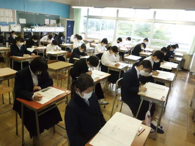 3年生は、2学期末テストの2日目、1,2年生は学力テストに取り組んでいます。