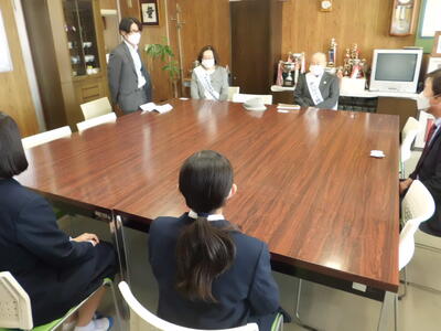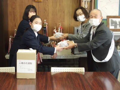 春日部市の人権教育推進担当3名の方にご来校いただき、人権の花「球根」を受け取りました。葛飾中学校の代表として2年生の生徒会長・副会長が参加しました。