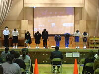 続いて表彰集会です。サッカー部、女子バドミントン部、野球部、女子バレーボール部、新俳句大賞、景観絵画コンクール、発明創意くふう展、社会を明るくする運動作文コンテスト、郷土を描く美術展、人権作文、の表彰が行われました。61名の生徒が呼名され、17名の生徒が校長先生から代表として賞状を受け取りました。