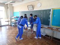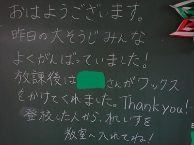 3時間目に大掃除があり、生徒が下校した後、環境委員が各教室のワックスがけをしてくれました。普段清掃できない箇所も含めて、感謝を持って取り組みました。