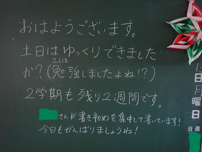 今日は風も弱く、穏やかな1日でした。今日で2学期は終了です。来年1月11日(火)に、また元気に登校してください。
