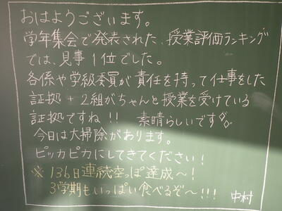1年2組が快挙達成です。2学期全て給食完食。通算136日連続。しかも継続中です。3学期もやりそうですね。